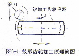 普通滾齒機(jī)具有主切削運(yùn)動(dòng)傳動(dòng)鏈、分齒運(yùn)動(dòng)傳動(dòng)鏈、進(jìn)給運(yùn)動(dòng)傳動(dòng)鏈和差動(dòng)運(yùn)動(dòng)傳動(dòng)鏈,通過(guò)調(diào)整,能夠滿足圓柱齒輪和蝸輪的加工要求。本改造的內(nèi)容是要使其能夠滿足特定鼓度曲線的鼓形齒輪的加工要求,即在鼓形齒輪一定的軸向位置有一定的徑向變位,這就需要增加一個(gè)加工運(yùn)動(dòng)的自由度。加工原理如圖6-1所示。