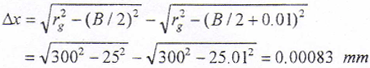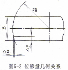 位移傳感器根據(jù)運(yùn)動(dòng)的型式不同分為直線位移傳感器和角度位移傳感器,直線位移傳感器常見(jiàn)的有光柵位移傳感器、感應(yīng)同步傳感器等,它們可以直接安裝在所測(cè)直線運(yùn)動(dòng)部件上,無(wú)傳動(dòng)誤差影響,精度高。但是由于結(jié)構(gòu)的原因,它們需要非常精確的安裝基準(zhǔn)和合適的安裝空間,且通常情況下安裝定位較困難。由于光柵的密封性較差,光柵材料較脆弱,所以它們的抗污染性能和抗振性能也較差,而且所需防護(hù)裝置也較復(fù)雜,成本較高。角度位移傳感器最常用的有光電編碼器,它具有精度高,體積小,安裝方便、密封性好、抗污染和抗振性能好等優(yōu)點(diǎn)。本設(shè)計(jì)需測(cè)刀架的位移,在刀架上,切削冷卻潤(rùn)滑油、切屑及粉塵的飛濺較嚴(yán)重,且不易設(shè)置防護(hù)裝置。如果采用光電編碼器需通過(guò)檢測(cè)絲桿的角位移間接檢測(cè)刀架的直線位移,但絲桿及傳動(dòng)機(jī)構(gòu)具有的傳動(dòng)精度和位移檢測(cè)精度是足夠的。另外,加工鼓形齒輪時(shí),形成鼓度曲線的實(shí)際切削位置通常在曲線較陡的范圍,例如加工圓弧鼓度曲線,幾何關(guān)系見(jiàn)圖6-3,設(shè)位移圓半徑rg=300mm,齒寬B=50mm,當(dāng)Δy=0.01mm,則