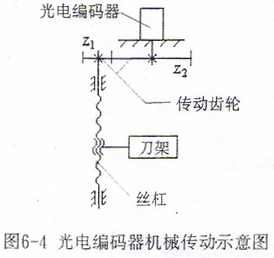 由于機(jī)床的刀架進(jìn)給絲桿的位置及結(jié)構(gòu)關(guān)系,通常不能將光電編碼器直接聯(lián)接在刀架進(jìn)給絲桿的端頭,需將絲桿的旋轉(zhuǎn)運(yùn)動(dòng)通過(guò)一對(duì)齒輪傳至光電編碼器。機(jī)械傳動(dòng)示意圖如圖6-4所示。