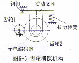 普通滾齒機(jī)具有刀架進(jìn)給絲桿的消隙機(jī)構(gòu),因此絲桿正反轉(zhuǎn)無(wú)間隙。齒輪的安裝有側(cè)隙存在,為了消除側(cè)隙對(duì)位移檢測(cè)影響,采用彈簧消隙機(jī)構(gòu),機(jī)構(gòu)簡(jiǎn)圖如圖6-5所示。光電編碼器安裝在活動(dòng)座上,其軸上裝有齒輪2,齒輪1與刀架進(jìn)給絲桿固連,活動(dòng)支座在彈簧作用下繞銷釘轉(zhuǎn)動(dòng),壓迫齒輪2與齒輪1使其無(wú)側(cè)隙。由于光電編碼器的驅(qū)動(dòng)力矩非常小,因此所需的彈簧的拉力也很小,不會(huì)對(duì)光電編碼的正常工作造成不良影響。