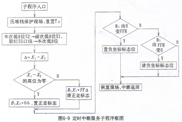 位移脈沖計(jì)數(shù)的高8位的處理采用差值法,設(shè)前后兩次的低8位二進(jìn)制數(shù)為X1、X2,高8位二進(jìn)制數(shù)為B1、B2,先求差值△=X2-X1,若△的最高位為1,則此時(shí)整個(gè)16位計(jì)數(shù)的十六進(jìn)制數(shù)為B1X1+FF△;若△的最高位為0,則為B1X1+0△。相應(yīng)的,若△的最高位為1時(shí),當(dāng)前刀架向Y坐標(biāo)負(fù)方向運(yùn)動(dòng);若△的最高位為0時(shí),當(dāng)前刀架向Y坐標(biāo)正方向運(yùn)動(dòng)。而高8位由FFH變?yōu)?0H時(shí),當(dāng)前刀架位置在Y坐標(biāo)大于零;高8位由00H變?yōu)镕FH時(shí),當(dāng)前刀架位置在Y坐標(biāo)小于零,此時(shí)應(yīng)取Y坐標(biāo)補(bǔ)碼進(jìn)行插補(bǔ)運(yùn)算。定時(shí)中斷服務(wù)子程序框圖見(jiàn)圖6-9。