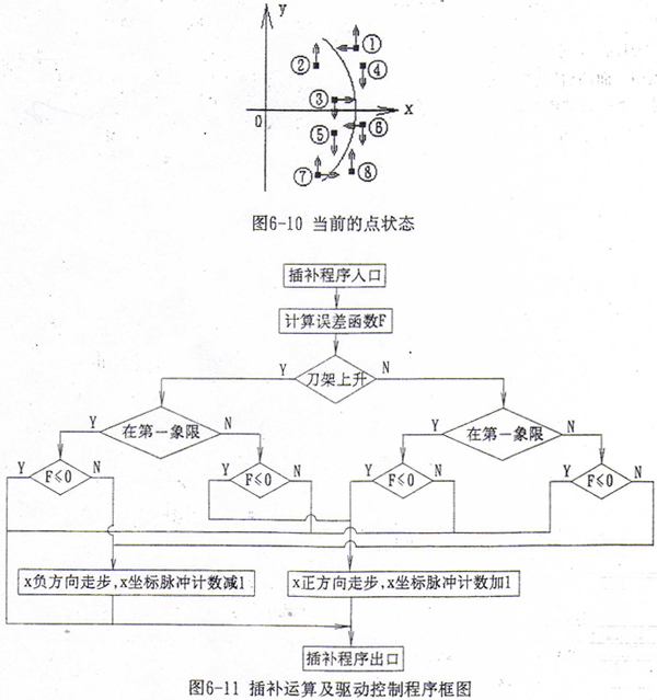 非圓弧曲線插補(bǔ)運(yùn)算時(shí),首先根據(jù)當(dāng)前的Y坐標(biāo)值及插補(bǔ)曲線f(x,y)=0,求解出x坐標(biāo)理論值xt,設(shè)當(dāng)前的實(shí)際x坐標(biāo)為xr,令誤差函數(shù)F=xr-xt。對(duì)圓弧曲線,根據(jù)當(dāng)前的x、y坐標(biāo),計(jì)算x2+y2值,令誤差函數(shù)F=x2+y2-R2。根據(jù)當(dāng)前點(diǎn)在不同象限、當(dāng)前刀架的運(yùn)動(dòng)方向及誤差函數(shù)的正負(fù),共有8種情況出現(xiàn)(如圖6-10所示),應(yīng)根據(jù)它們的狀態(tài)進(jìn)行不同的處理。①、⑥兩種情況應(yīng)使當(dāng)前點(diǎn)向x坐標(biāo)負(fù)方向走步;③、⑦兩種情況應(yīng)使當(dāng)前點(diǎn)向x坐標(biāo)正方向走步;②、④、⑤、⑧四種情況無(wú)需在x坐標(biāo)方向走步。由于在切齒過(guò)程中刀架的進(jìn)給速度較低,最高一般不超過(guò)30毫米/分鐘,兩次y坐標(biāo)計(jì)數(shù)脈沖間隔時(shí)間可達(dá)幾十毫秒,而插補(bǔ)運(yùn)算的時(shí)間不超過(guò)1毫秒,因此插補(bǔ)速度足夠。在刀架快速運(yùn)動(dòng)時(shí),插補(bǔ)有滯后,但此時(shí)不切削,這種滯后不影響加工。在插補(bǔ)過(guò)程中,顯示器輪流顯示當(dāng)前的x、y坐標(biāo)值,以利于操作者監(jiān)視加工情況,因此還需進(jìn)行顯示BCD碼的轉(zhuǎn)換和輪換的控制。插補(bǔ)運(yùn)算及驅(qū)動(dòng)控制程序框圖見(jiàn)圖6-11。
