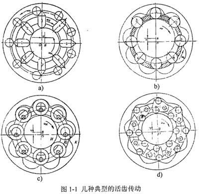 活齒少齒差行星傳動簡稱為活齒傳動,是由K-H-V型少齒差行星齒輪傳動演化而成的一種新型齒輪傳動,并利用一組中間活動件——活齒來傳遞兩同軸間的回轉運動。常見的活齒傳動分為推桿活齒傳動(圖1-la)、滾柱(鋼球)活齒傳動(圖1-1b)、套筒活齒傳動(圖1-1c)、擺動活齒傳動(圖1-ld)等。因為活齒傳動具有結構緊湊、傳動比范圍廣、承載能力大、傳動效率高等優點,所以它一出現就引起科技工作者的廣泛注意。