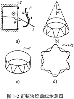 正弦活齒傳動屬于活齒少齒差行星齒輪傳動,是一種利用鋼球和正弦滾道組成的滾動嚙合變速裝置。按照正弦曲線軌跡所在回轉面的類型,正弦活齒傳動可分為平面正弦活齒、圓柱正弦活齒及圓錐正弦活齒傳動等,圖1-2所示為共扼正弦曲線軌跡的示意圖。當φ從0到2π變化,正弦曲線Γ在回轉面上被描述出來。如果Θ代表主動軸坐標系,則曲線Γ表示主動軸回轉面上的正弦曲線,若Θ代表殼體坐標系,則曲線Γ表示殼體回轉面上正弦曲線。回轉面可以是錐面(圖1-2b)、圓柱面(圖1-2c)、平面(圖1-2d),還可以為拋物面、雙曲面、超環面等。若按與活齒嚙合的正弦滾道數目劃分,正弦活齒傳動可分為雙正弦活齒傳動(圖1-3)和三正弦活齒傳動(圖1-4)。