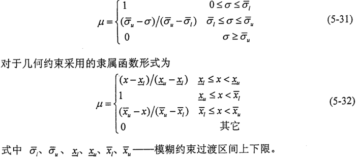 5.4.3.2隸屬函數及容差的確定 模糊約束的隸屬函數,應根據約束的性質來具體確定,為簡便計算,本文均采用線性嫦娥屬函數,對于性能約束采用的隸屬函數形式為