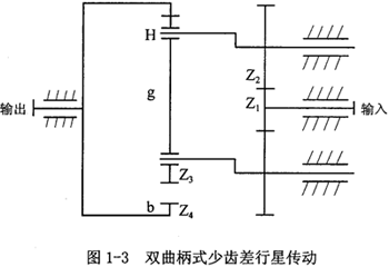 RV傳動作為一種新型傳動,由于具有良好的動、靜態特性,對其進行的研究和應用較為廣泛。雙曲柄式少齒差行星傳動則將輸入運動和輸出運動分別由中心輪和行星輪承擔,如圖1-3所示。該機構一方面省取了輸出機構W,避免了由輸出機構所帶來的弊病,另一方面用一個平行四邊形機構(雙曲柄)代替了轉臂H,設置了同步嚙合的定軸齒輪副,經減速后再將運動輸送給少齒差輪系,這樣可獲得更大的速比,使機構更為緊湊和有效;當總速比相同時,動軸上齒輪的轉速較低、運轉比較平穩、動載荷和噪音較小。