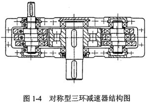 盡管我國在三環減速器的研究方面取得了許多令人矚目的成果,但由于三環減速器的研發時間較短,對有些問題研究的還不夠深入,生產中存在的一些實際問題還未從根本上得到解決,制約了這種新裝置的推廣使用。我國開發的三環減速器的基本型結構主要有兩種,一是兩高速軸對稱布置于輸出軸兩側的對稱型三環減速器,如圖1-4所示,另一種是兩高速軸布置于輸出軸同側的偏置型三環減速器。
