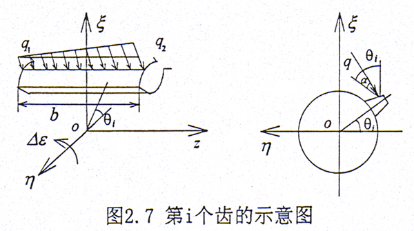 在外載荷較大時,則齒輪聯軸器內外齒面之間接觸良好。設齒面上的載荷是線性分布,其集度分別為q1、q2,如圖2.7所示。在繞η方向給一小轉角△δ,則在第i個齒對產生的扭矩為Mηi。b是穩態時內外齒之間的有效接觸齒寬。