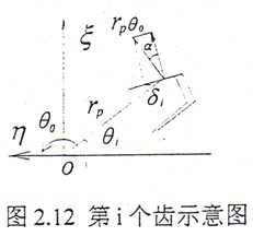 設內、外齒輪有一相對扭轉振幅θ0,如圖2.12所示,則第i對齒面間相對滑動位移為δi=rpθ0sinα。第i對齒對上的摩擦力消耗的能量為