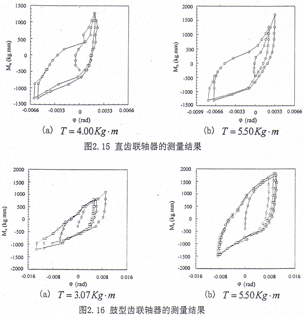 (5)對鼓形齒聯軸器在加載階段轉的平均轉角剛度ka進行了計算,結果如下:在T=3.07kg·m時,ka≈9.2×104kg·mm;在T=5.50gk·m時,ka≈1.1×105kg·mm。對于直齒聯軸器Mx-φ的關系呈現出非線性,轉角剛度ka即為曲線的斜率,從圖2.15可知轉角剛度ka是變化的。在轉角取大值時,ka值較大;在轉角取小值時,ka值比較小。為了便于比較,在此對文獻[31]中(其中參數為:鼓形齒輪聯軸器模數為2.5,齒數為35,T=15.0kg·m,鼓形量為113~140微米)的測試結果也進行了計算,結果為ka≈9.1×105kg·mm,造成二者結果的差距主要是外載荷和由于齒輪結構參數的不同而引起齒對剛度具有相當大的差別,但從總體來說這一轉轉角剛度的數量級不大。因此在實際系統的動力學分析中,齒輪聯軸器的轉角剛度應取一小量。