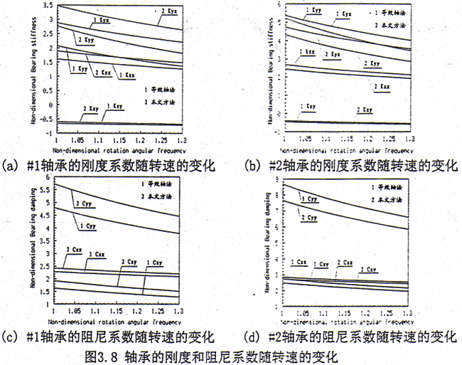 從以上的計算結果來看,用等效軸法計算軸承的軸心位置,#1軸承處的偏心率明顯偏小,偏位角偏大,而在#2軸承處則正相反。這表明采用等效軸法會使轉子的平衡位置產生較大的誤差,也預示著#1軸承和#2軸承之間負荷分配的變化。另外比較#1和#2軸承的結果,還可以看出,聯軸器的作用使得二個軸承的負荷分配趨于接近,而等效軸法從某種意義上講相當于二個轉子的直接對接,必將造成二軸承負荷分配不均,在工作轉速下各軸承處的負荷分配見表3.2,因此對軸承的受力來說這也正是采用齒輪聯軸器的優點所在。從二軸承處的動特性來看,#1軸承的各項剛度和阻尼系數比等效軸法大,而#2軸承的各項剛度和阻尼系數則比等效軸法小,這歸根到底也是軸承負荷分配發生了變化的結果。如果采用單軸分析方法計算,以左側轉子為例,由于聯軸器的質量與圓盤相比要小許多,系統近似為一對稱轉子系統,則作用在#1和#2軸承上的負荷相差不大,因此二個軸承處的動特性系數也比較接近。由于軸承的靜、動特性發生了變化,因此勢必引起系統動態特性的變化。