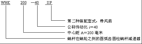 1、本機結構為單級,包括以下四種: (1) WHT 通用型(2) WHX 蝸桿在下型 (3) WHS 蝸桿在上型(4) WHC 蝸桿在側型 2、中心矩A mm 本系列規定為42、65、80、100、120、125、150、160、180、200、210、250、280、300、320、360、400、420、450、500共十三種。 3、公稱傳動比: 本系列為8、10、12.5、16、20、25、31.5、40、50共九種。 4、裝配形式:用羅馬數字Ⅰ、Ⅱ、Ⅲ……表示,帶風扇的在后面加“F” 5、標記示例: